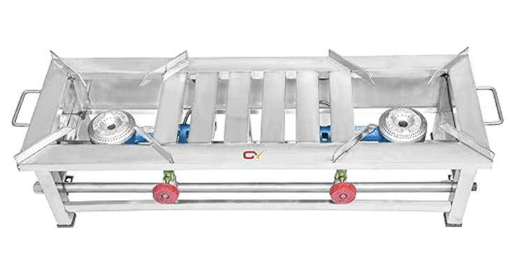 - வணிகம், கேன்டீன், ஹோட்டல், உணவகம், கடை போன்றவற்றுக்கான CAY பிராண்ட் ஹெவி டியூட்டி ஸ்டெயின்லெஸ் ஸ்டீல் பெரிய அளவு இரட்டை சுடர் ஸ்டெயின்லெஸ் ஸ்டீல் உயர் அழுத்த பட்டி கேஸ் ஸ்டவ் சூல்ஹா. அளவு - 10L X 30W X 9H அங்குலம் முழுமையான துணைக்கருவிகள் தொகுப்புடன்.
