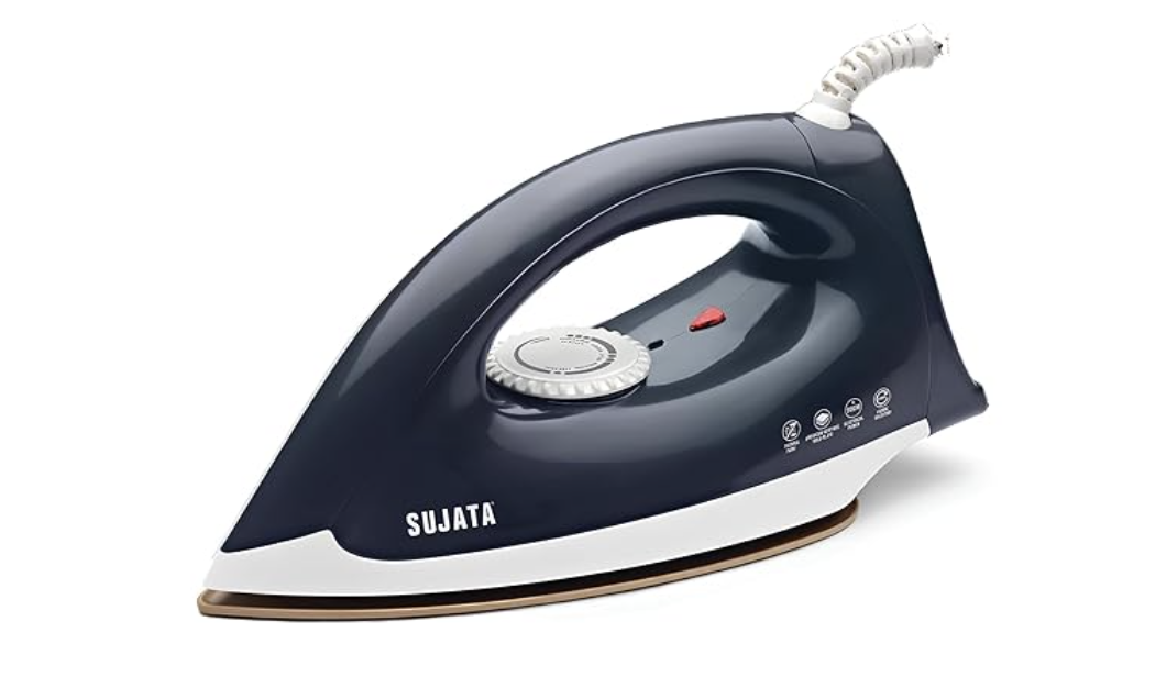 சுஜாதா ஸ்மூத் ஸ்லைடு 1100 வாட்ஸ், ஸ்டெயின்லெஸ் ஸ்டீல் உலர் இரும்பு | அதிக வெப்ப பாதுகாப்பு வெப்ப உருகி | அமெரிக்கன் ஹெரிடேஜ் டபுள் கோட் நான்-ஸ்டிக் | தந்திரமான பகுதிகளுக்காக வடிவமைக்கப்பட்டது