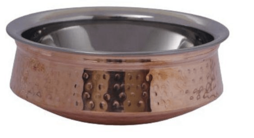 இந்த கைவினைஞர் செம்பு-அடித்தளம் பரிமாறும் கிண்ணம் மூலம் உங்கள் சாப்பாட்டு மேசைக்கு பாரம்பரியத்தையும் நேர்த்தியையும் கொண்டு வாருங்கள். நீடித்த ஸ்டெய்ன்லெஸ் ஸ்டீல் உட்புறம் மற்றும் அழகாக சுத்தியல் செய்யப்பட்ட செம்பு வெளிப்புறத்தைக் கொண்ட இந்த டிஷ், கறிகள், பருப்பு வகைகள், சாதம் அல்லது உங்களுக்குப் பிடித்த உணவுகளை பரிமாறுவதற்கு ஏற்றது. ஸ்டெய்ன்லெஸ் ஸ்டீல் மற்றும் செம்பு ஆகியவற்றின் கலவையானது அதன் அழகியல் கவர்ச்சியை மேம்படுத்துவதோடு மட்டுமல்லாமல் உகந்த உணவு வெப்பநிலைக்கு வெப்ப விநியோகத்தையும் சீராக ஆதரிக்கிறது. அன்றாட பயன்பாட்டிற்கும் பண்டிகை சந்தர்ப்பங்களுக்கும் ஏற்றது.