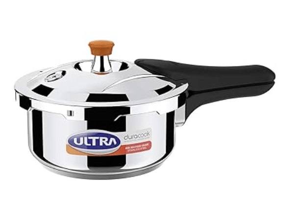அல்ட்ரா டூராகுக் 2.L ஸ்டெயின்லெஸ் ஸ்டீல் வெளிப்புற மூடி, AISI 304 உணவு தர SS பிரஷர் குக்கர் (2 லிட்டர்), நுரை சேகரிப்பான், கசிவு கட்டுப்பாடு, தூண்டல் & குக்டாப் இணக்கமானது, ஊசி வார்ப்பு செய்யப்பட்ட பேக்கலைட் கைப்பிடிகள், ISI.