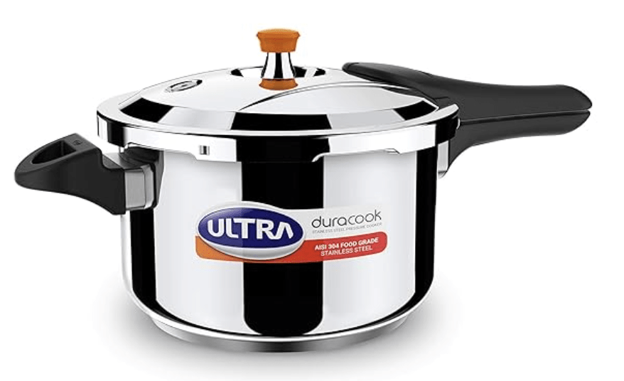 அல்ட்ரா டூராகூக் 5.5 எல் ஸ்டெயின்லெஸ் ஸ்டீல் பிரஷர் குக்கர் AISI 304 ஃபுட் கிரேடு SS பிரஷர் குக்கர் (5.5 எல்), ஃப்ரோத் கலெக்டர், ஸ்பிலேஜ் கண்ட்ரோல், இண்டக்ஷன் & குக்டாப் இணக்கமானது, இன்ஜெக்ஷன் மோல்டட் பேக்கலைட் ஹேண்டில்கள், ISI.