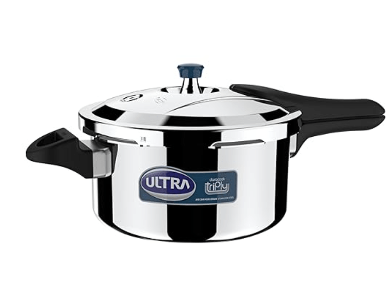 அல்ட்ரா டூராகூக் டிரிபிள் 4.5 எல் பிரஷர் குக்கர், எஸ்எஸ் 304 ஃபுட் கிரேடு, 'எஸ்சிடிஎஸ்' ஆன்டி-பல்ஜிங், ஃப்ரோத் கலெக்டர், பிராட் பேஸ் விரைவு சமையல் - காஸ் சேமிக்கிறது. சாலிட் பேக்லைட் ஹேண்டில்கள், 3 லேயர்டு பாடி, இண்டக்ஷன், ஐஎஸ்ஐ, 5 ஒய் உத்தரவாதம்