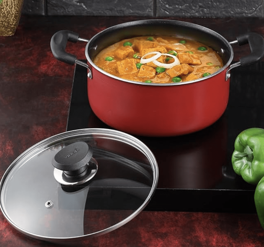 வினோத் ஜெஸ்ட் இண்டக்டோ அலுமினியம் நான் ஸ்டிக் சாஸ்பாட், கண்ணாடி மூடியுடன் - 3.1 லிட்டர், 20 செ.மீ | 3 மிமீ தடிமன் | சுவிஸ் தரம் | 3 அடுக்கு பூச்சு | நச்சு இல்லாதது | இண்டக்ஷன் பேஸ் | 2 வருட உத்தரவாதம்
