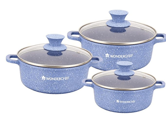 வொண்டர்செஃப் கிரானைட் டை-காஸ்ட் அல்லாத-ஸ்டிக் 6-பீஸ் கேசரோல் செட் மூடிகளுடன் | இண்டக்ஷன் பாட்டம் | சாஃப்ட்-டச் ஹேண்டில்ஸ் | விர்ஜின் கிரேடு அலுமினியம் | PFOA மற்றும் கன உலோகங்கள் இலவசம் | 3.5 மிமீ தடிமன் | 2 வருட உத்தரவாதம் | நீலம்