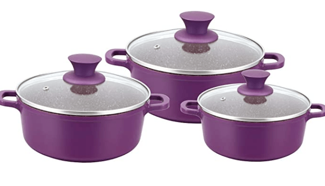 வொண்டர்செஃப் கிரானைட் டை-காஸ்ட் நான்-ஸ்டிக் 6-பீஸ் கேசரோல் செட் மூடிகளுடன் | இண்டக்ஷன் பாட்டம் | சாஃப்ட்-டச் ஹேண்டில்ஸ் | விர்ஜின் கிரேடு அலுமினியம் | PFOA மற்றும் கன உலோகங்கள் இலவசம் | 3.5 மிமீ தடிமன் | 2 வருட உத்தரவாதம் | ஊதா