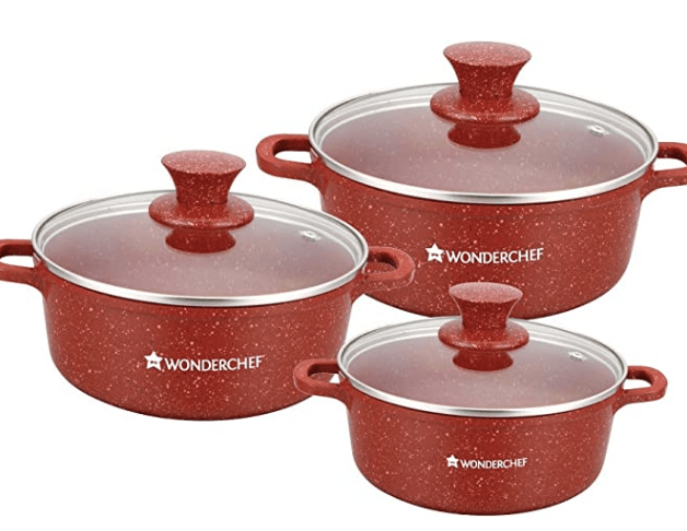 வொண்டர்செஃப் கிரானைட் டை-காஸ்ட் நான்-ஸ்டிக் 6-பீஸ் கேசரோல் செட் மூடிகளுடன் | இண்டக்ஷன் பாட்டம் | சாஃப்ட்-டச் ஹேண்டில்ஸ் | விர்ஜின் கிரேடு அலுமினியம் | PFOA மற்றும் ஹெவி மெட்டல்கள் இலவசம் | 3.5 மிமீ தடிமன் | 2 வருட உத்தரவாதம் | சிவப்பு