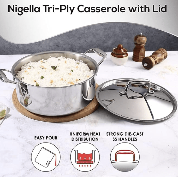 வொண்டர்செஃப் நிஜெல்லா ட்ரை-பிளை ஸ்டெயின்லெஸ் ஸ்டீல் 24 செ.மீ கேசரோல் | 4.8 லிட்டர் | 2.6மிமீ தடிமன் | இண்டக்ஷன் பேஸ் | அனைத்து சமையல் பாத்திரங்களுடனும் இணக்கமானது | ரிவெட்டட் கூல்-டச் ஹேண்டில் | 10 வருட உத்தரவாதம்